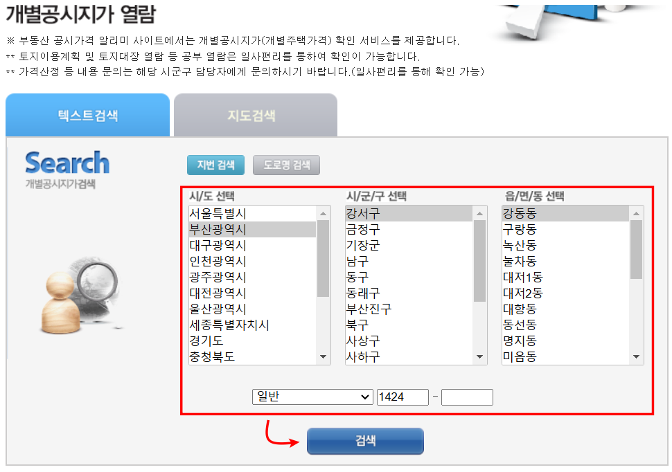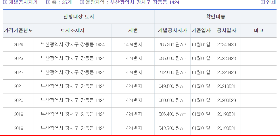 토지 개별공시지가 조회방법 토지 개별공시지가 조회결과